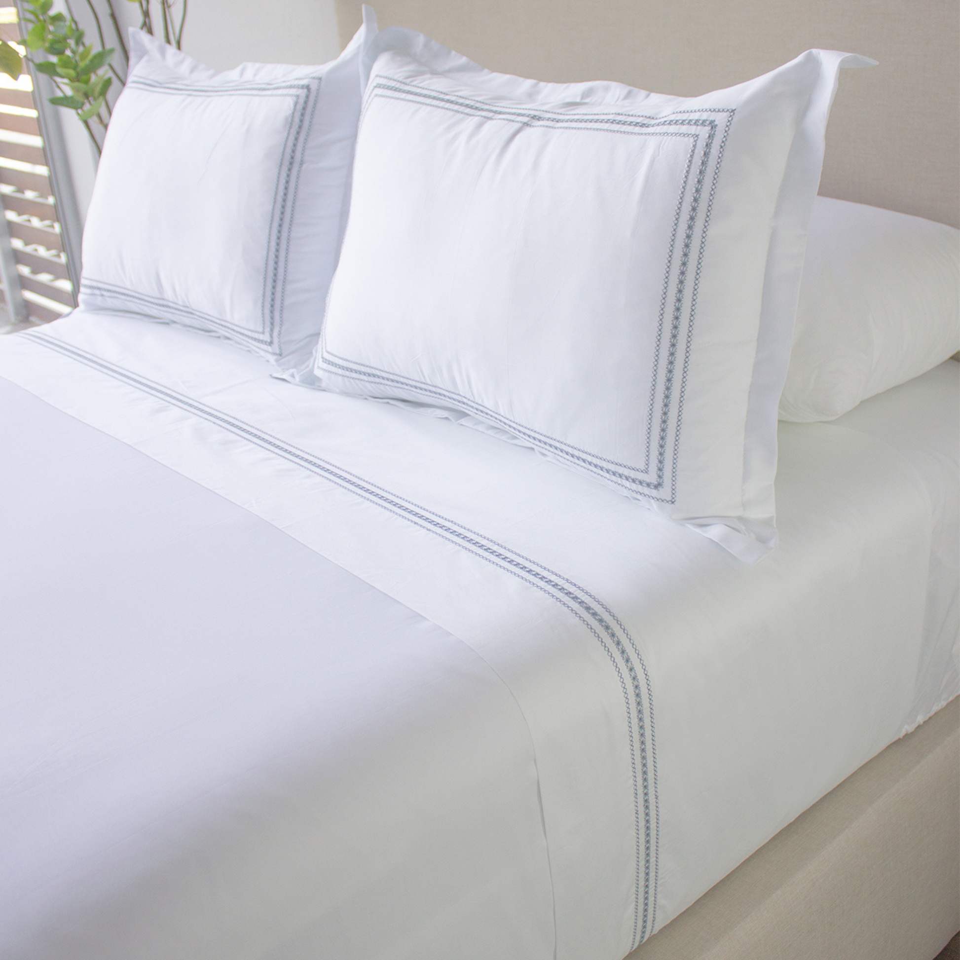 Dale un toque sofisticado a tu cama con esta sábana plana blanca, decorada con elegante bordado Jules. Confeccionada en tela Plat de 300 hilos y 100% algodón, brinda suavidad, frescura y alta durabilidad.